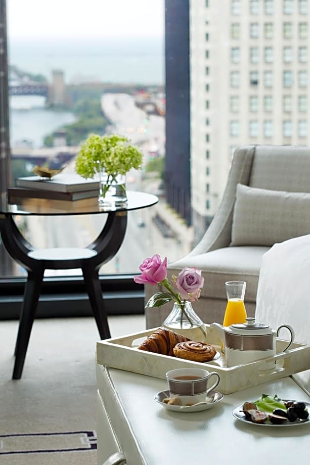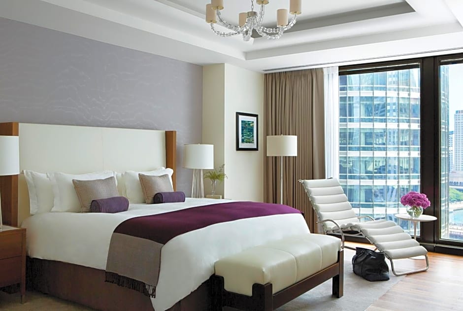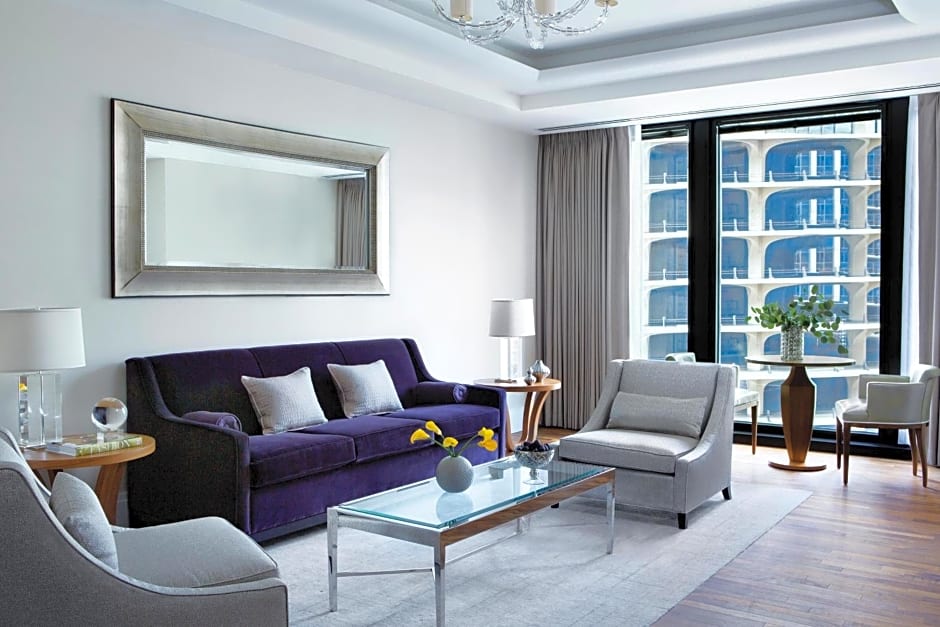 Located on the upper floors of the hotel, this one-bedroom suite features a mix of classic style and contemporary furnishings, a view of the Chicago River and a separate seating area, allowing for private entertainment.